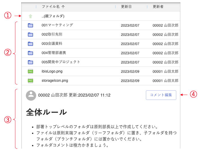 - クリックすると親フォルダへ移動します。ルートフォルダや参加フォルダでは表示されません。