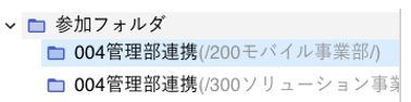 上図のようなフォルダ構成のとき、「モバイル事業部」と「ソリューション事業部」フォルダは管理部グループ所属のユーザーはアクセス権がないとします。そして、その中に「管理部連携」フォルダがあり、そのフォルダには管理部グループに対して読み取り権限以上がある場合は、「管理部連携」フォルダは、管理部グループ所属のユーザーからみたとき参加フォルダとなります。